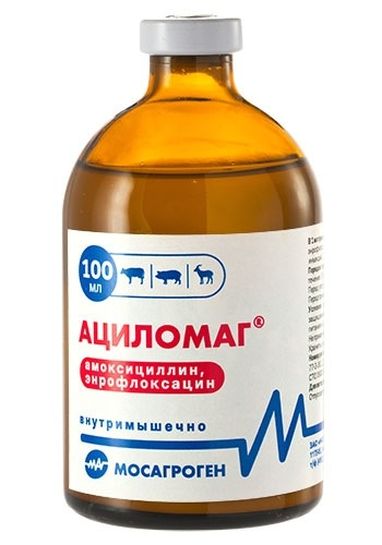 Лечение у свиней, крупного рогатого скота и овец бактериальных инфекций, возбудители которых чувствительны к амоксициклину и энрофлоксацину, в т.ч.: — колибактериоз; — сальмонеллез; — пастереллез; — респираторные и другие бактериальные инфекции. Противопоказания к применению препарата АЦИЛОМАГ® — период беременности; — тяжелые нарушения функции печени и почек; — повышенная чувствительность животного к пенициллинам и фторхинолонам.