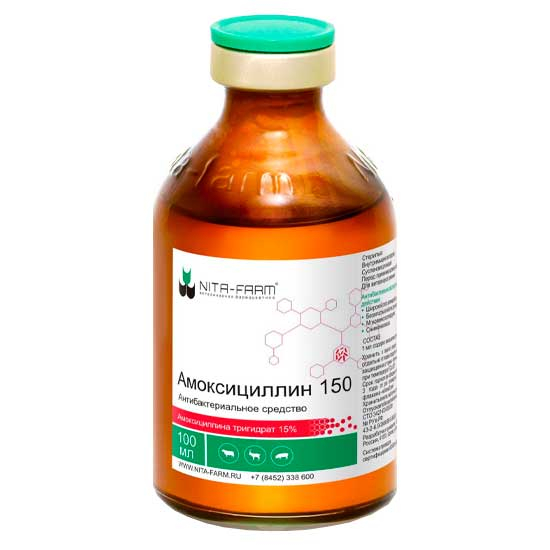 Назначают крупному рогатому скоту, овцам, козам, свиньям, собакам и кошкам для лечения бактериальных инфекций желудочно-кишечного тракта (включая энтерит, гастроэнтерит, гастроэнтероколит), респираторных заболеваний (включая бронхит, бронхопневмонию, ринит), хирургических болезней (включая раны, абсцессы, воспаления суставов), заболеваний мочеполовой системы (метрит, эндометрит, цистит, уретрит, пиелонефрит), болезней кожи и мягких тканей (включая пупочные инфекции), а также осложнений, вызванных микроорганизмами, чувствительными к амоксициллину. Для лечения лептоспироза, мастита, агалактии у свиней, актиномикоза, рожи свиней, парагриппа и паратифа. ПРОТИВОПОКАЗАНИЯ Повышенная чувствительность к амоксициллину и другим пенициллинам. Запрещается вводить внутривенно. Не разрешается применять кроликам, хомякам, морским свинкам и песчанкам. Амоксициллин нельзя смешивать с другими лекарственными препаратами в одном шприце, а также нельзя использовать одновременно с бактериостатическими химиотерапевтическими средствами. Препарат не следует назначать при инфекциях, вызываемых бактериями, образующими пенициллиназу.