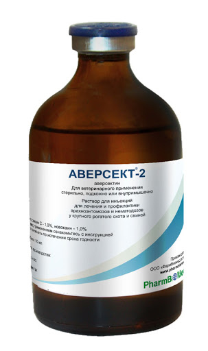 Убой животных на мясо разрешается не ранее, чем 21 сутки после последнего применения Аверсекта-2. В случае вынужденного убоя животных ранее установленного срока мясо может быть использовано в корм зверям или для переработки на мясо-костную муку.