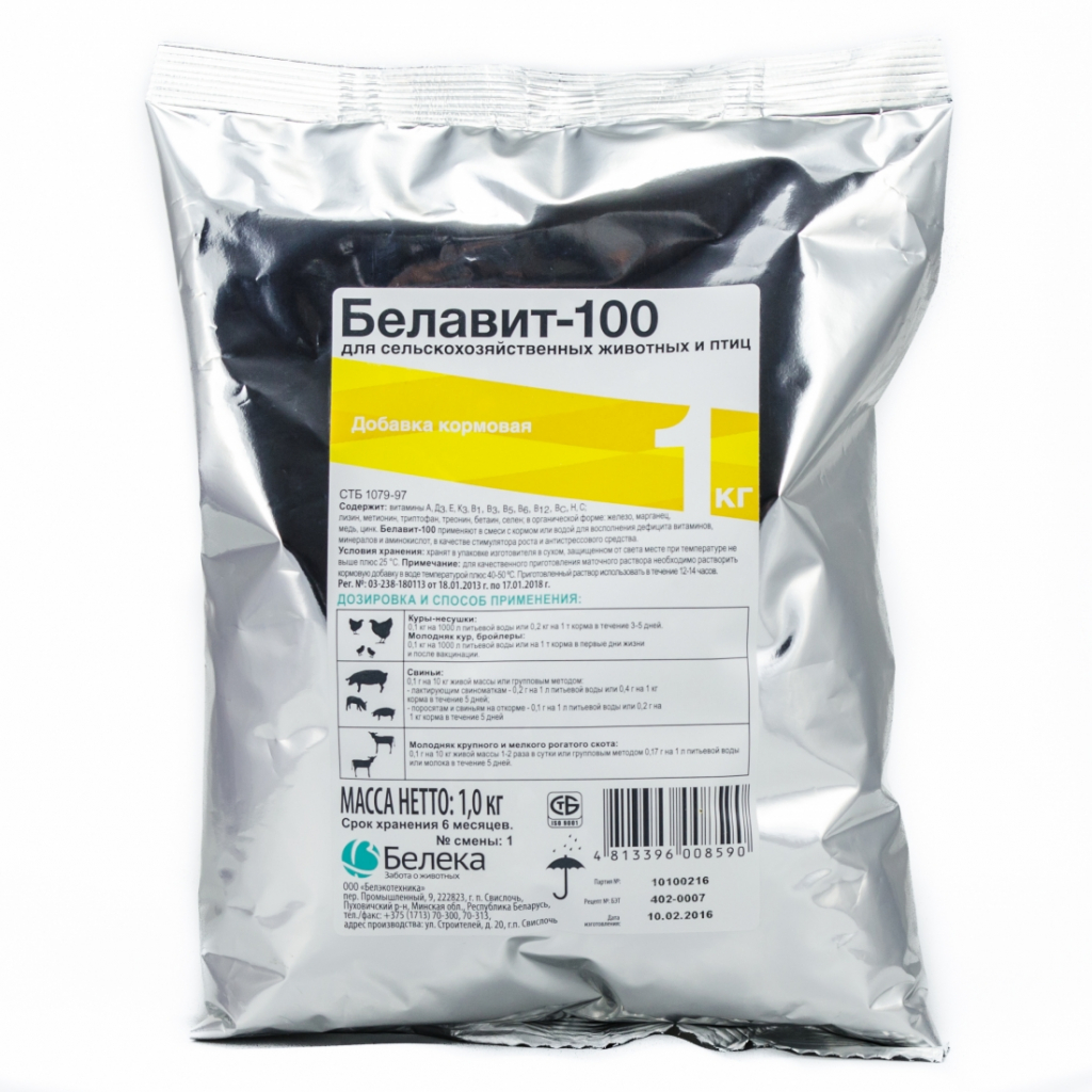 | Применение | Белавит-100 применяют в смеси с кормом или водой в следующих дозах: Куры-несушки: 0,1 кг на 1000 л питьевой воды или 0,2 кг на 1 т корма в течение 3-5 дней. Молодняк кур, бройлеры: 0,1 кг на 1000 л питьевой воды или на 1 т корма впервые дни жизни и после вакцинации. Свиньи: 0,1 г на 10 кг живой массы или – лактирующим свиноматкам – 0,2 г на 1 л питьевой воды или 0,4 г на 1 кг корма в течение 5 дней; – поросятам и свиньям на откорме – 0,1 г на 1 л питьевой воды или 0,2 г на 1 кг корма в течение 5 дней. Молодняк крупного и мелкого рогатого скота: 0,1 г на 10 кг живой массы или – 0,17 г на 1 л питьевой воды или молока в течение 5 дней. При нормативной жесткости воды предел растворимости препарата составляет 2-3 г/л питьевой воды. |