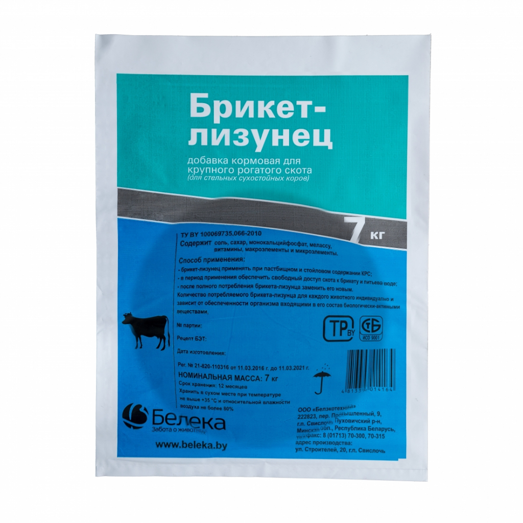 Брикеты лизунцы размещаются в удобном месте, обеспечивающем свободный доступ для животных. Точного дозирования не требуется. Среднесуточное потребление зависит от индивидуальных потребностей организма.Форма выпуска Прессованные брикеты, от сине-зеленого до сине-фиолетового цвета, мозаичной структуры массой по 7 кг. Срок годности Один год от даты изготовления