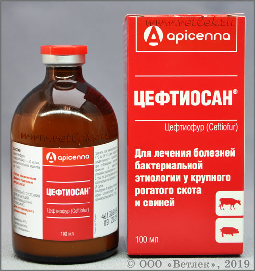 Назначают крупному рогатому скоту и свиньям с лечебной целью при респираторных заболеваниях, межпальцевом некробактериозе, остром послеродовом метрите и других первичных и вторичных инфекциях бактериальной этиологии, возбудители которых чувствительны к цефтиофуру гидрохлориду. ПРОТИВОПОКАЗАНИЯ Повышенная индивидуальная чувствительность животного к β-лактамным антибиотикам. Цефтиосан не следует назначать совместно с тетрациклинами, хлорамфениколом, макролидами и линкозамидами, а также смешивать в одном шприце с другими лекарственными средствами.