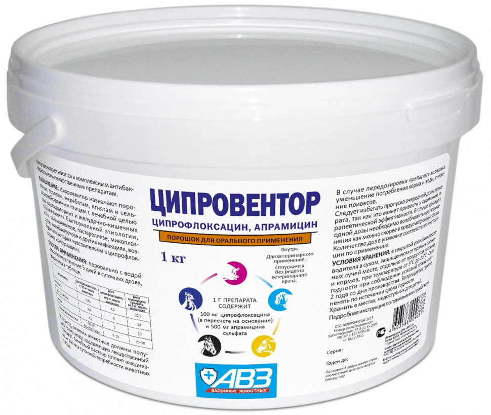 Ципровентор назначают поросятам, телятам, жеребятам, ягнятам и сельскохозяйственным птицам с лечебной целью при респираторных и желудочно-кишечных заболеваниях бактериальной этиологии, в т.ч. сальмонеллезе, пастереллезе, микоплазмозе, колибактериозе и других инфекциях, возбудители которых чувствительны к ципрофлоксацину и апрамицину. Противопоказанием к применению является повышенная индивидуальная чувствительность животного к компонентам препарата. Запрещается применять препарат курам-несушкам и лактирующим животным, а также животным с выраженной почечной недостаточностью. Не допускается одновременное применение Ципровентора с аминогликозидами (стрептомицином, неомицином, канамицином, гентамицином) из-за возможного ототоксического и нефротоксического действия, а также с β-лактамными антибиотиками, минеральными добавками и лекарственными препаратами, содержащими соли кальция, магния, железа и алюминия, ввиду возможного снижения антибактериальной активности препарата.