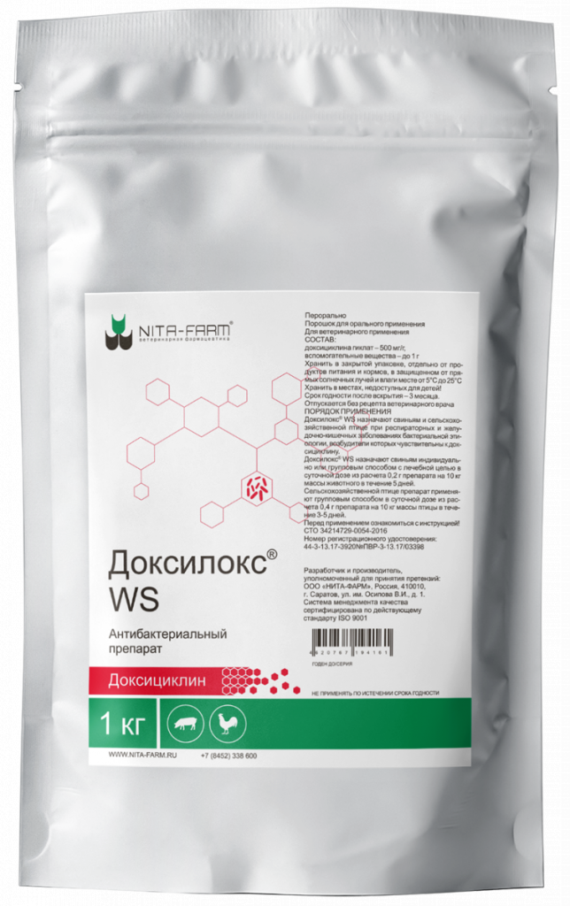 Убой птицы на мясо разрешается не ранее чем через 8 суток, свиней – не ранее чем через 12 суток после последнего применения препарата Доксилокс® WS. Мясо животных, вынужденно убитых до истечения указанных сроков, может быть использовано в корм пушным зверям.