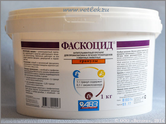 Фаскоцид применяют для дегельминтизации крупного рогатого скота, овец и коз при остром и хроническом фасциолезе, дикроцелиозе и парамфистомидозах.