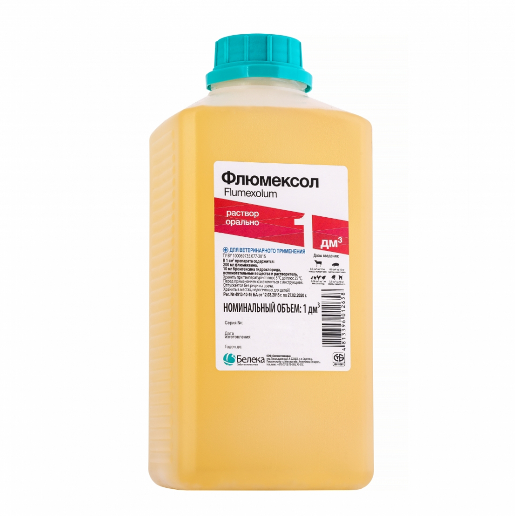 | Применение | Препарат применяют для лечения молодняка крупного и мелкого рогатого скота, свиней, плотоядных и пушных зверей, птицы с инфекционными заболеваниями дыхательной, пищеварительной и мочеполовой систем, первичных и вторичных инфекциях бактериальной этиологии, возбудители которых чувствительны к флюмеквину. Препарат задают внутрь в течение 3-5 дней в дозах: - телятам, ягнятам, козлятам, жеребятам – по 0,3 мл препарата на 10 кг массы животного 2 раза в сутки. Препарат задают индивидуально смешивая с питьевой водой, молоком, обратом, заменителем цельного молока; - свиньям – индивидуально по 0,5 мл препарата на 10 кг массы животного 2 раза в день с небольшим количеством корма или воды.Групповым способом – 0,5 л препарата на тонну воды для поения; - сельскохозяйственной птице в суточной дозе 0,06 мл на 1 кг массы птицы. Групповым способом с питьевой водой доза для птицы до 14 дневного возраста составляет 0,25 л на тонну воды, птице старше 14 дневного возраста – 0,5 л на тонну воды для поения. При сальмонеллезе, смешанных инфекциях, а также при хронических формах заболеваний птицы курс лечения продлевают до семи дней. В период лечения птица должна получать только воду, содержащую лекарственное средство; - плотоядным и пушным зверям – индивидуально по 0,3 мл препарата на 10 кг массы животного 2 раза в день с небольшим количеством корма или воды. Групповым способом – 0,5 л препарата на тонну воды для поения. Лечение стафилококковых инфекций в течение семи дней. Приготовленный раствор препарата необходимо использовать в течение 24 ч. Для разведения препарата не использовать воду с повышенным содержанием ионов кальция, магния и железа. |