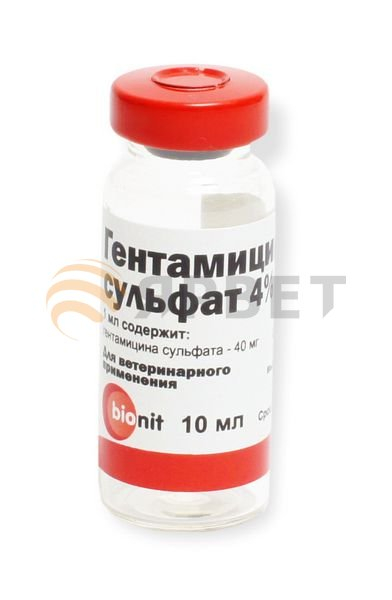 Гентамицина сульфат 4% раствор применяют для лечения крупного рогатого скота, свиней, лошадей, собак и кошек при болезнях бактериальной этиологии; респираторных и желудочно-кишечных заболеваниях, сепсисе, перитоните' менингите, пиелонефрите и других заболеваниях животных, вызванных чувствительными к антибиотику микроорганизмами. Противопоказанием для применения препарата является индивидуальная повышенная чувствительность животного к гентамицину, период беременности, тяжёлые нарушения функции почек. Не допускается одновременное или последовательное применение гентамицина с другими ото- и нефротоксичными препаратами (стрептомицином, канамицином, неомицином, апрамицином).