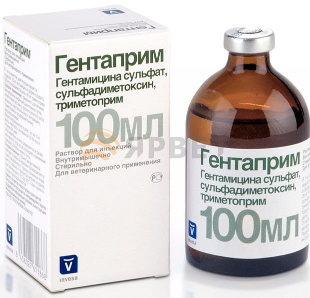 Назначают крупному рогатому скоту, лошадям, мелкому рогатому скоту, свиньям, собакам и кошкам для лечения инфекций, вызванных бактериями, чувствительными к гентамицину и сочетанию сульфадиметоксин-триметоприм, в том числе: инфекций дыхательных путей (пневмония, бронхопневмония, бронхит), диареи, дизентерии, колибактериоза, энтерита, септицемии, метрита и эндометрита, пиелита, пиелонефрита, цистита, уретрита, пастереллеза, маститов, паротита, кожных инфекций, актиномикоза, гнойных абсцессов, осложнений при вирусных заболеваниях, сальмонеллеза, парагриппа. ПРОТИВОПОКАЗАНИЯ Повышенная индивидуальная чувствительность к компонентам препарата. Не допускается одновременное или последовательное применение гентаприма с другими ото- и нефротоксичными препаратами (стрептомицином, канамицином, неомицином), а также с диуретиками и миорелаксантами. Не вводить совместно с препаратами, содержащими парааминобензойную кислоту (ПАБК), оказывающую противодействие сульфаниламидам. С большой осторожностью следует назначать гентаприм животным с нарушением функции почек.