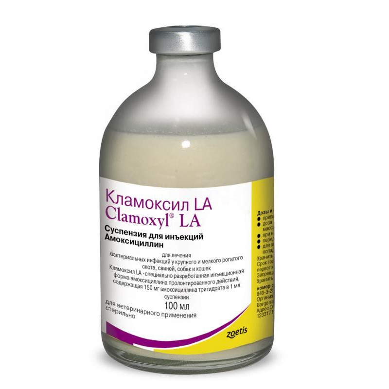 Кламоксил LA применяют для лечения крупного и мелкого рогатого скота, свиней, собак и кошек при бактериальных инфекциях желудочно-кишечного тракта, дыхательных путей, мочеполовой системы, кожи и мягких тканей, некробактериозе, ранах, абсцессах, воспалении суставов, пупочных инфекциях, атрофическом рините у поросят, а также для профилактики хирургических инфекций. Противопоказанием к применению Кламоксила LA является индивидуальная повышенная чувствительность животных к антибиотикам пенициллинового ряда. Лекарственный препарат не следует применять при инфекциях, вызываемых бактериями, образующих пенициллиназу.