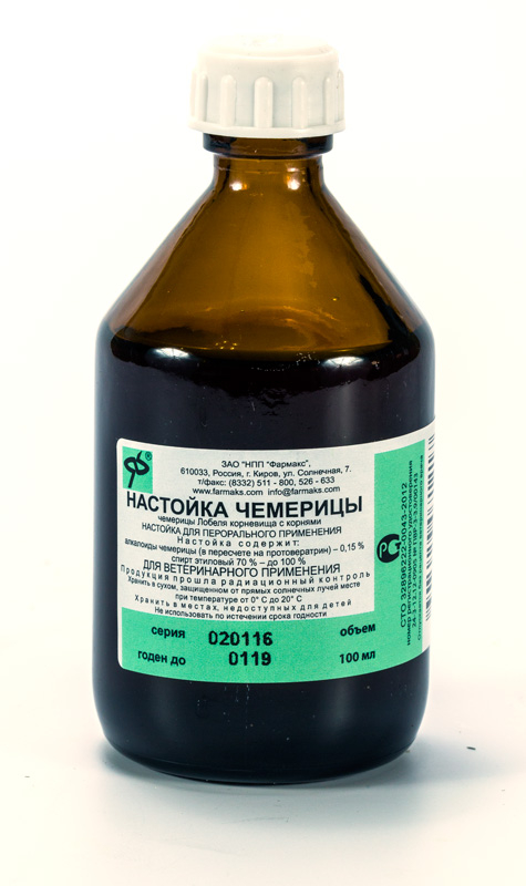 Настойку чемерицы вводят внутрь в следующих дозах: крупному рогатому скоту — 5 – 12 мл на одно животное или 0,01 – 0,024 мл на 1 кг веса животного; овцам и козам — 2 – 4 мл на одно животное или 0,04 – 0,08 мл на 1 кг веса животного; свиньям — 1 – 2 мл на одно животное или 0,014 – 0,028 мл на 1 кг массы животного; собакам — 0,05 – 2 мл на одно животное или 0,05 – 0,2 мл на 1 кг массы животного 1 – 2 раза в день до выздоровления.