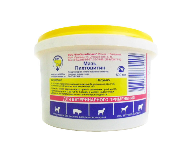 При ушибах и маститах Пихтоин накладывают в форме согревающих повязок. При повторной обработке Пихтоином, ранее нанесенную мазь следует удалить с поверхности обрабатываемого участка стерильной марлей.