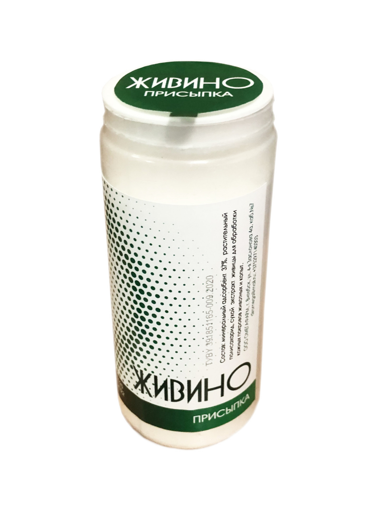 Присыпка Живино изготовлена на основе экстракта живицы, не создаёт плёнки на поврежденной коже и не забивает поры кожи. Это обеспечивает свободный доступ кислорода к повреждённым клеткам тканей, ускоряя естественные процессы регенерации кожи у животных. Диоксид кремния, обладая выраженными сорбционными свойствами, вбирает в себя не только кровь, которая служит хорошей питательной средой для бактерий, но и связывает грязь, осушает кожу. Живино обладает выраженным дренирующим и дезодорирующим действием. 1.3 Диоксид кремния является не только сорбентом. В его порах содержится большое количество микроэлементов, необходимых для нормализации обменных процессов в клетках. Вбирая в себя выделения кожи, диоксид обеспечивает микроэлементами поверхностные ткани, что ускоряет процесс их регенерации. Для ускорения процесса регенерации кожи и подсушивающего эффекта в состав средства введен сухой экстракт живицы