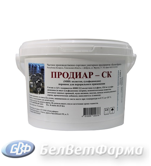 Продиар-СК применяют телятам и поросятам при колибактериозе, сальмонеллезе, клостридиозе, гастроэнтероколитах и других желудочно-кишечных заболеваниях бактериальной этиологии, в том числе сопровождающихся диареей, дегидратацией и интоксикацией организма.