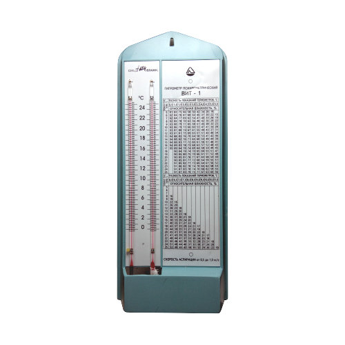 Гигрометр состоит из пластмассового основания, на котором закреплены температурная шкала с двумя капиллярами, один из которых увлажняется фитилем из ткани, опущенным в питатель с водой, и таблица для определения относительной влажности.