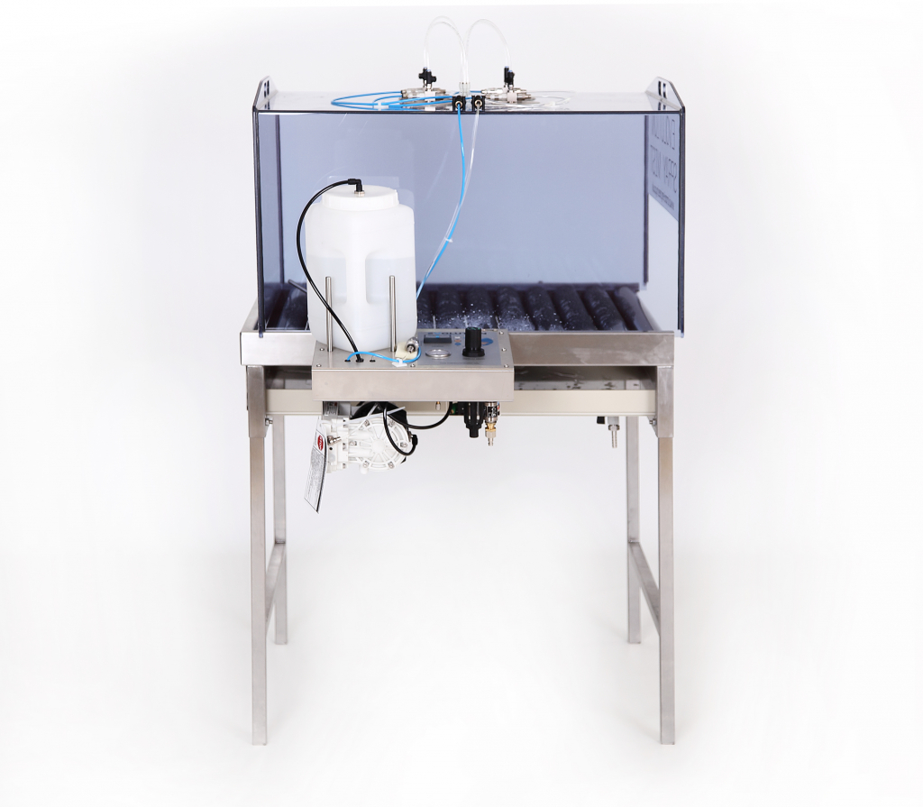 | · 75 х 90 х 115 см · Вес 30 кг · Модульная конструкция, что облегчает сборку и обслуживание · Полностью безопасные коррозионно-стойкие материалы, нержавеющая сталь | · Дозировка: 5,0 – 30,0 мл · Размер капли: 75 – 300 мкн. · Регулируемая зона распыления (4 форсунки), гарантирует вакцинацию всех цыплят в ящике · Быстрое безкапельное отсечение подачи вакцины после распыления | · Манометр для контроля давления линии сжатого воздуха. · При подаче ящика с цыплятами происходит автоматическая спрей-вакцинация · 3 типоразмера форсунок (по 4 шт каждого вида) производят капли от 75 до 300 мкн.