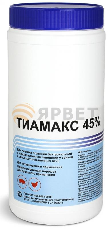 ТИАМАКС 45% — водорастворимый порошок для орального применения применяют с лечебно-профилактической целью свиньям при дизентерии, энзоотической пневмонии и плевропневмонии, курам и индейкам при микоплазменных инфекциях, вызванных M. gallisepticum, M. synoviae и M. meleagridis.