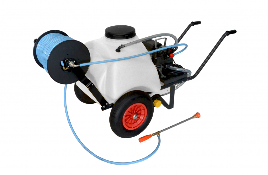 Емкость бака 120 л, бак из полиэтилена, вес нетто 23 кг, мотопомпа с электрическим мотором 1,5 HP и насосом AR252 (код 603МО), катушка без шланга 612/5B, шланг 50 метров (код TP1040), пистолет для опрыскивания рычажный (код 174/60) или с поворотной ручкой (код 180/65).