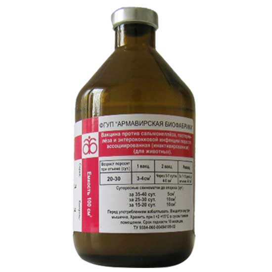 Вакцина предназначена для профилактики сальмонеллеза, пастереллеза и энтерококковой инфекции поросят в неблагополучных и угрожаемых по данным болезням хозяйствах. Запрещается вакцинировать животных клинически больных, с повышенной температурой тела, ослабленных, истощенных. Вакцинации подлежат супоросные свиноматки за 15-40 дней до опороса и поросята 20-30 дневного возраста.