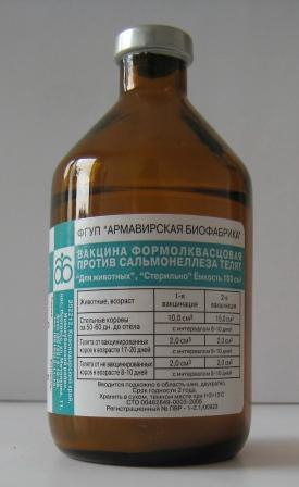 Вакцина предназначена для профилактики сальмонеллеза молодняка крупного рогатого скота. Запрещается вакцинировать животных с повышенной температурой тела, ослабленных, клинически больных. Вакцинации подлежат телята в возрасте от 8 суток и старше и стельные коровы за 50-60 суток до отела.