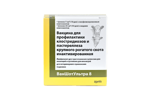 — для профилактики клостридиозов крупного рогатого скота, вызываемых Clostridium chauvoi, Clostridium septicum, Clostridium haemolyticum, Clostridium novyi, Clostridium sordellii, Clostridium perfringens типов С и D; — для профилактики пневмонии крупного рогатого скота, вызванной Mannhemia haemolytica. Противопоказания к применению препарата ВАНШОТУЛЬТРА 8 — больные и ослабленные животные.