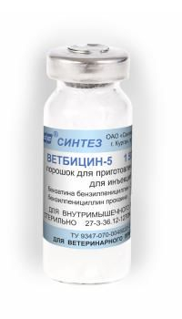 Перед применением во флакон с Ветбицином-5, проколов колпачок и пробку, добавляют 5 – 6 мл воды для инъекций (или стерильного изотонического раствора хлорида натрия, или 1 – 2 % стерильного раствора новокаина), флакон тщательно встряхивают до образования гомогенной суспензии, которую немедленно вводят животному глубоко внутримышечно. В случае если игла попала в сосуд и появилась капля крови, иглу необходимо вынуть и повторить инъекцию в другое место. Полученную суспензию вводят животным однократно.