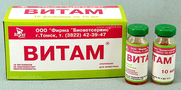 Витаминно-аминокислотный комплекс «Витам» вводят животным внутримышечно или подкожно. С профилактической целью (в весенний период, период беременности и интенсивного использования, при стрессах, в восстановительный период после заболеваний, новорожденным телятам и поросятам при вакцинации) препарат применяют в дозе 1,5 – 2 мл на 10 кг веса животного 2 раза в неделю в течение месяца. С лечебной целью «Витам» вводят в дозе 3 – 5 мл на 10 кг веса животного 2 раза в сутки в течение 3 – 5 дней. При интоксикациях (отравлении синтетическими и пищевыми ядами) витаминно-аминокислотный комплекс «Витам» используют в десятикратной лечебной дозировке. В случае если вводимая доза препарата превышает 20 мл, рекомендуется вводить ее несколькими инъекциями в разные точки. Витаминно-аминокислотный комплекс «Витам» совместим с другими лекарственными средствами и кормовыми добавками.