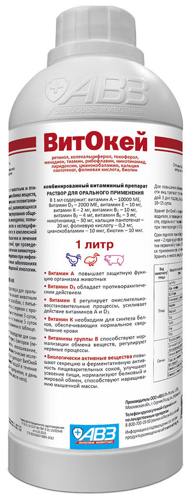Жеребым кобылам и стельным коровам препарат применяют двукратно – в первый и последний период беременности. Свиноматкам трехкратно – при отъеме поросят, в день определения супоросности, за 7–14 дней до опороса. Хрякам, в период активной эксплуатации, препарат применяют каждые две недели, но не более 5 раз. В зимнее время перед применением "ВитОкей" следует подогреть на водяной бане до 20–25°С. "ВитОкей" в форме раствора для орального применения назначают животным и птице групповым способом, с питьевой водой или в смеси с кормом и индивидуально (на корень языка) с профилактической целью в течение 3 суток, с лечебной целью – в течение 5 суток в суточных дозах, указанных в таблице. В промышленном птицеводстве для снижения воздействия стресс факторов (пересадка, сортировка, взвешивание, транспортировка, диагностические исследования, вакцинация) препарат "ВитОкей" применяют с питьевой водой в течение 5 суток (2 суток до мероприятия, в день мероприятия и 2 суток после него).