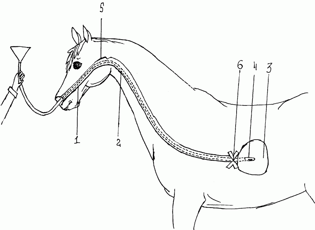 После того как вы убедились, что зонд находится в желудке, свободный его конец фиксируют, обвязывая у ноздрей бинтом. Концы бинта закрепляют на переносье недоуздка или уздечки. После этого начинают процедуру промывания. Свободный конец зонда вставляют в воронку, через которую непрерывно вливают до 10 л воды с температурой 38-40 °С. Затем воронку вынимают и конец зонда опускают. Часть жидкости выливается, а оставшуюся отсасывают при помощи откачивающих приборов (шприц Жане, вакуум-насос Комовского). Процедуру повторяют 3-4 раза. При откачивании жидкости следует проявлять осторожность, чтобы не создать чрезмерного отрицательного давления в желудке, при котором участки слизистой оболочки желудка присасываются к отверстию зонда и травмируются.